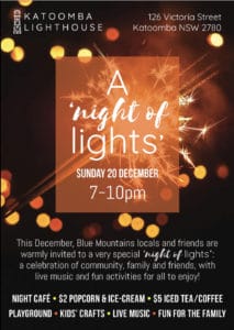 In the Blue Mountains, Katoomba Lighthouse Church is hosting ‘A Night of Lights’ on Sunday 20 December, a fun night that will feature Christmas lights, hot popcorn, ice cream, hot or cold tea and coffee, casual busking music and a photo booth.